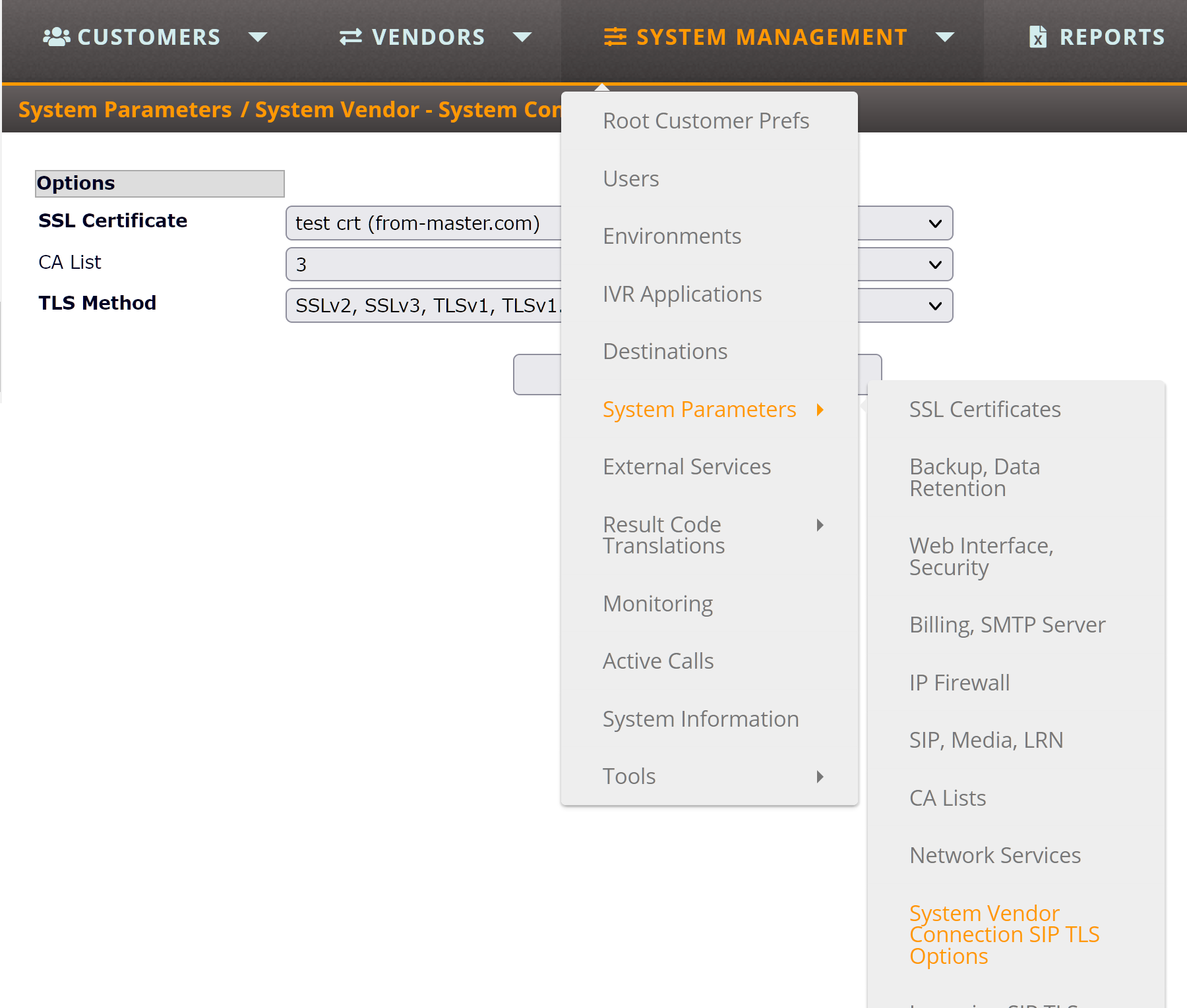 2. Then add the new TLS certificate from System Management - System Parameters - SSL Certificates.
