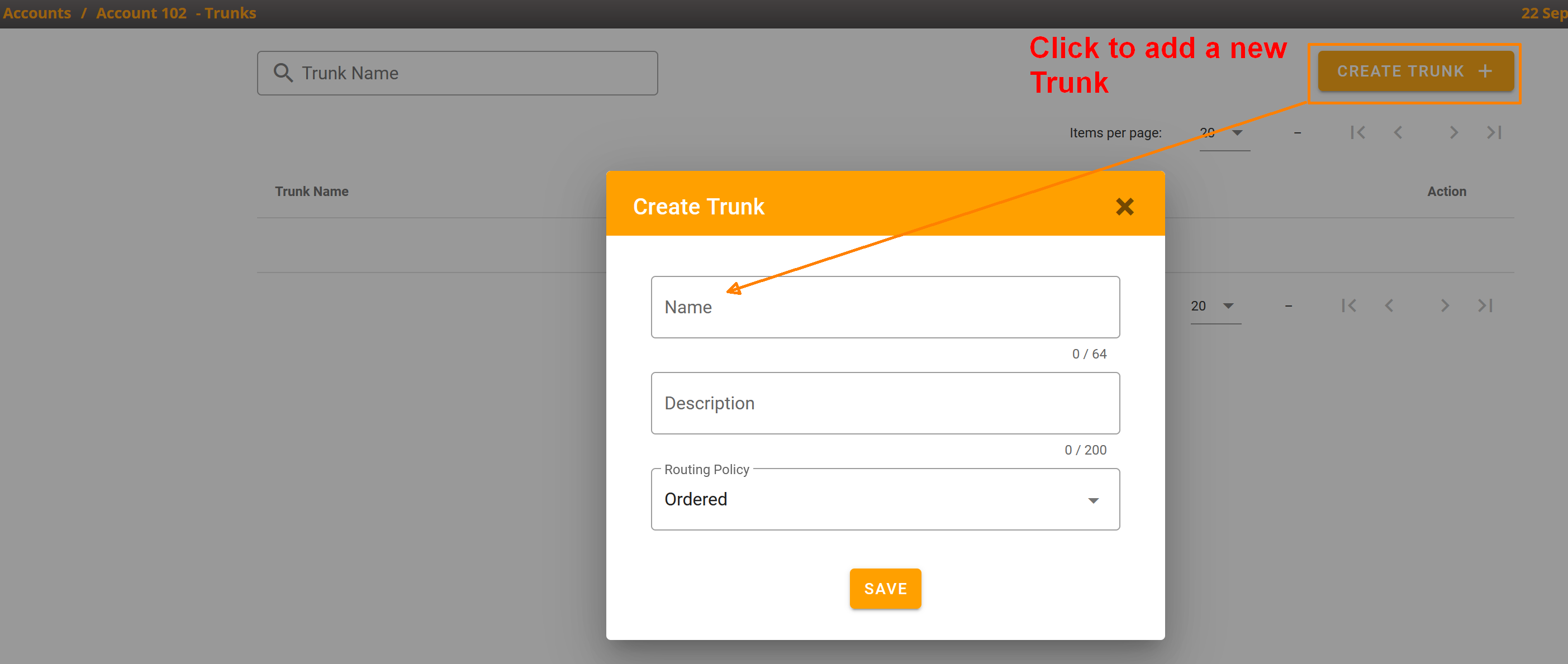 3) Press "Create" button to create a new Trunk and fill Name with optional Description and Routing Policy