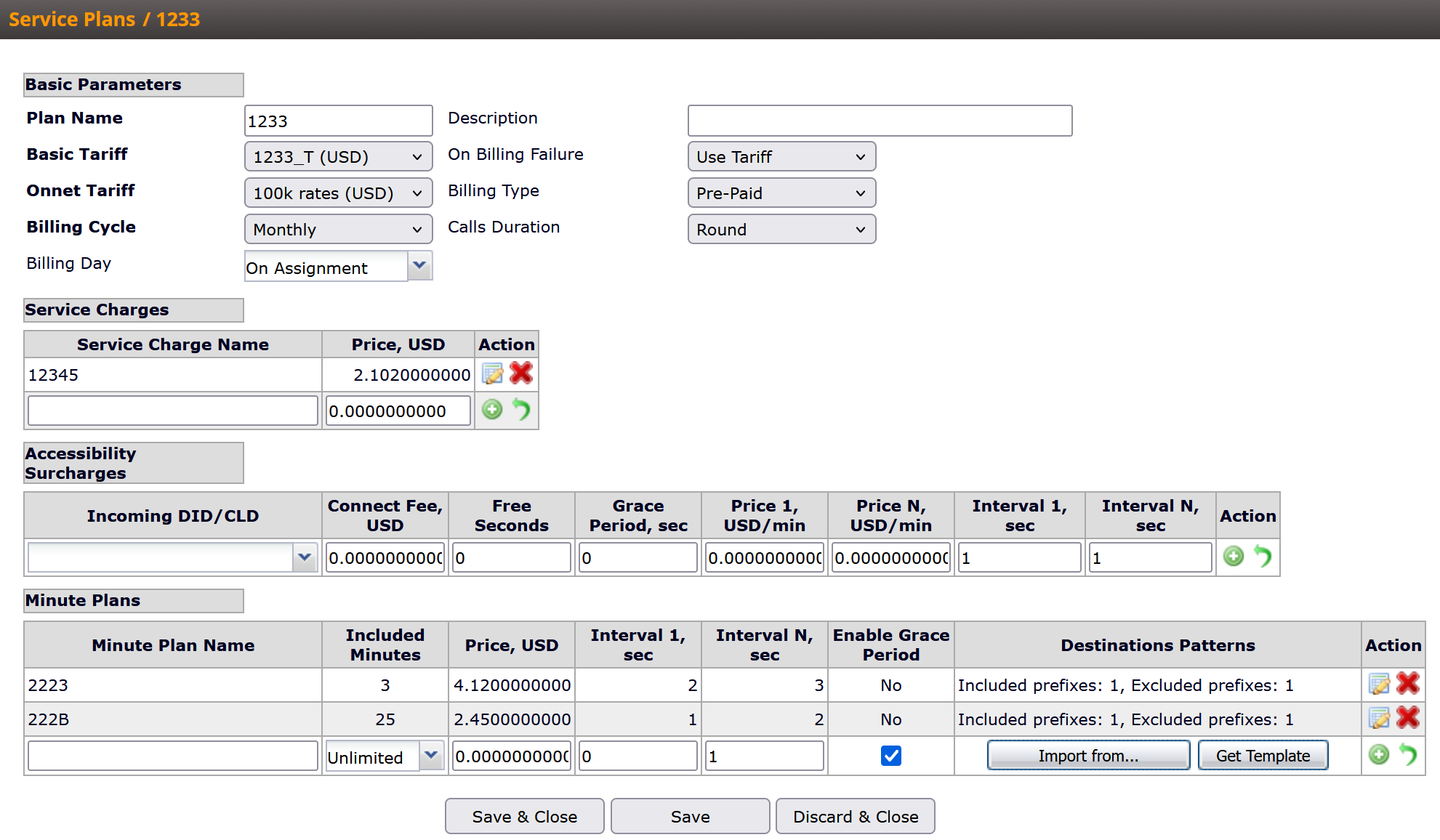 A Service Plan defines how an Account is billed for recurring service fees and bundled usage. It combines the basic tariff used for rated calls, optional recurring service charges, optional minute plans, and optional accessibility surcharges for specific incoming DID/CLD patterns.